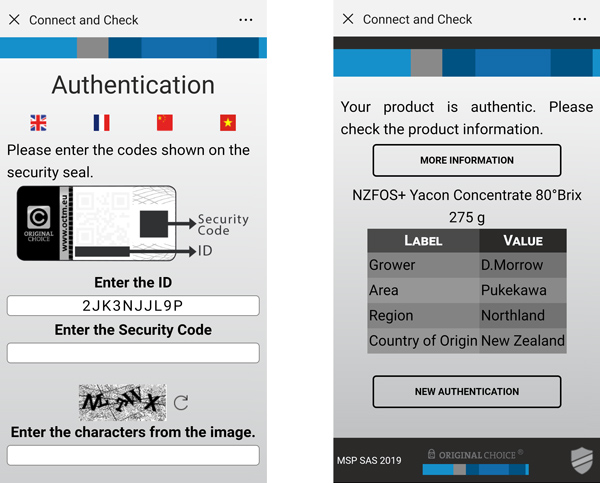 为了保证 NZFOS+ 雪莲果果浆产品的真实性,我们以统一的包装销售我们的产品,并在外包装上使用防伪溯源技术。每一个 NZFOS+ 产品包装上都配备“防伪标签” (COA)。