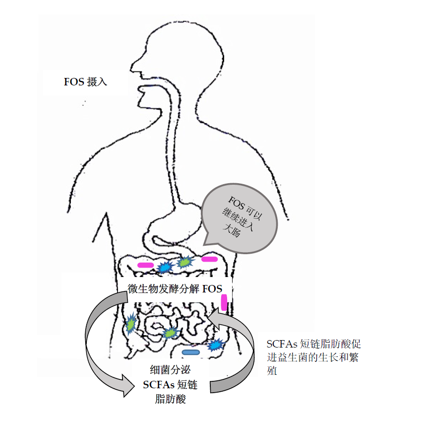 图2.低聚果糖(FOS)作为益生元在胃肠道中的作用机制; SCFA:短链脂肪酸