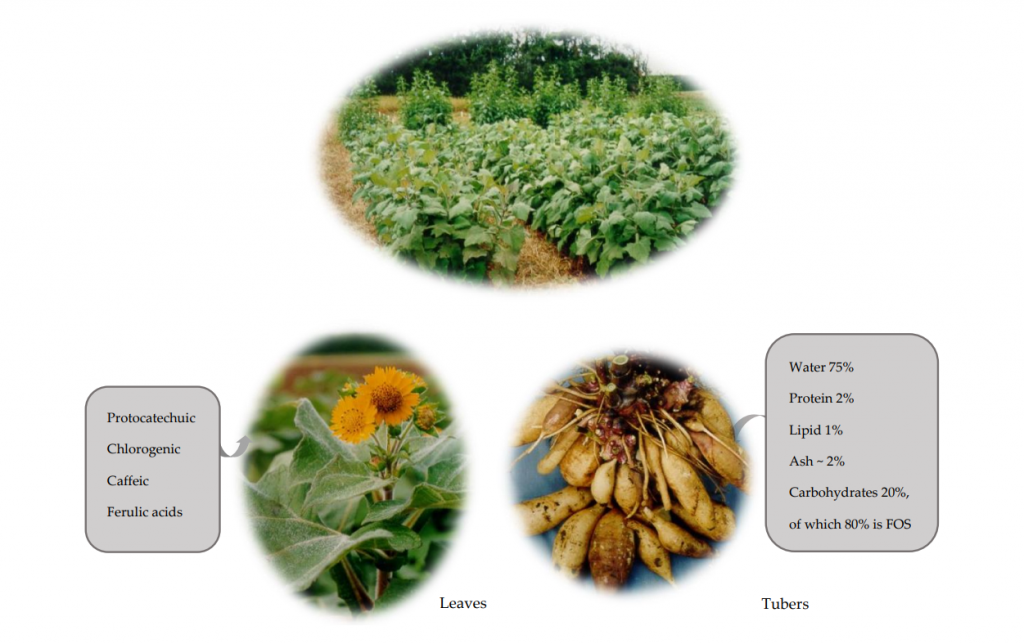 Yacon的根部富含酚类化合物,因此是潜在的新型抗氧化剂来源[13,36,71]。 此外,由于其菊粉和FOS含量高(高达yacon根干物质的70%),yacon已显示出重要的益生元特性。