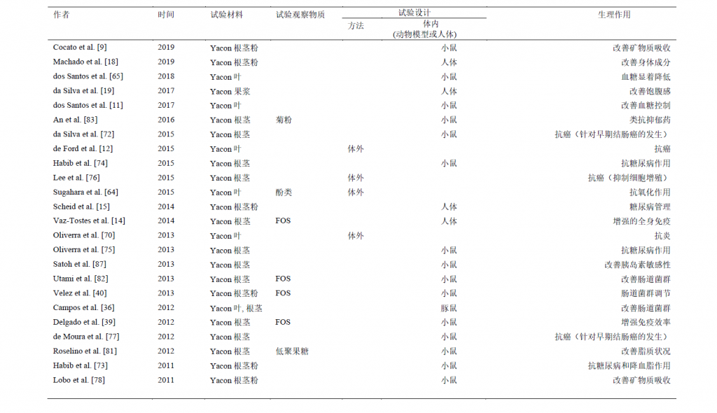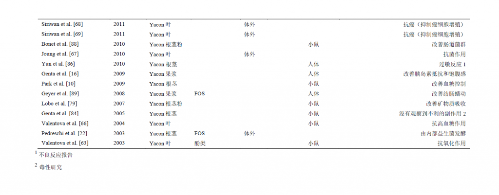 人类和动物研究表明,食用Yacon对促进健康和预防慢性病具有健康益处。 表1总结了Yacon非人类和动物模型的体外和体内研究。