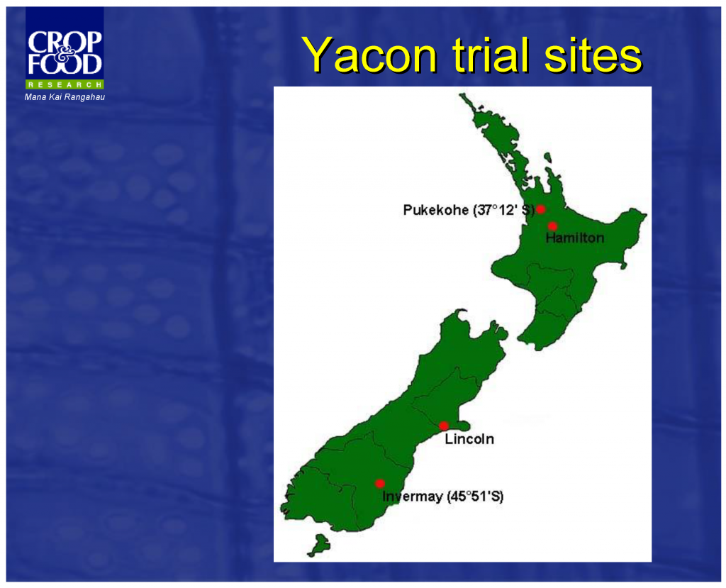 图3. Yacon由新西兰Crop and Food 研究所带到新西兰,并根据Yacon的基本农艺在不同地区的小块土地上进行了10年的试验,以测算并优化生长和收获条件。